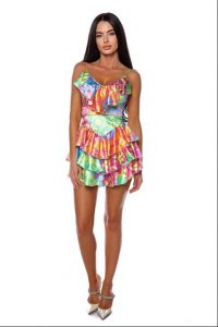 Saint Tropez dress este un manifest de culoare și feminitate. Realizată din satin fin cu imprimeu vibrant în nuanțe solare – galben, fucsia și verde lime – îți conturează silueta prin talia accentuată și volanele jucăușe. Croiala mini o transformă într-un statement pentru zilele călduroase de vară. Se potrivește perfect cu tocuri colorate sau sandale flat și accesorii îndrăznețe.