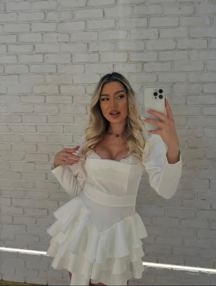 Butterfly cu volane alb este o rochie albă cu o prezență scenică puternică – ideală pentru evenimente sofisticate, apariții red carpet sau petreceri memorabile. Croiul mini este completat de o fustă cu volane bogate, care oferă mișcare și eleganță, iar zona bustului impresionează prin decupajele atent poziționate și decolteul unic în formă de aripi de fluture.