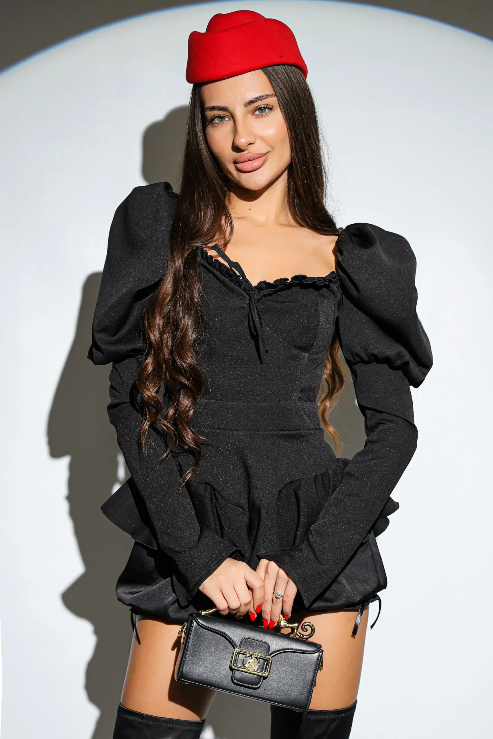 Acest top elegant este alegerea perfectă pentru femeile care iubesc ținutele sofisticate și moderne. Croiala cu umeri bufanți adaugă volum și eleganță, în timp ce volanul plasat în talie evidențiază silueta și creează un efect spectaculos. Materialul fin oferă confort, iar nuanța clasică de negru îl face ușor de integrat atât în ținute de seară, cât și în apariții casual-chic.