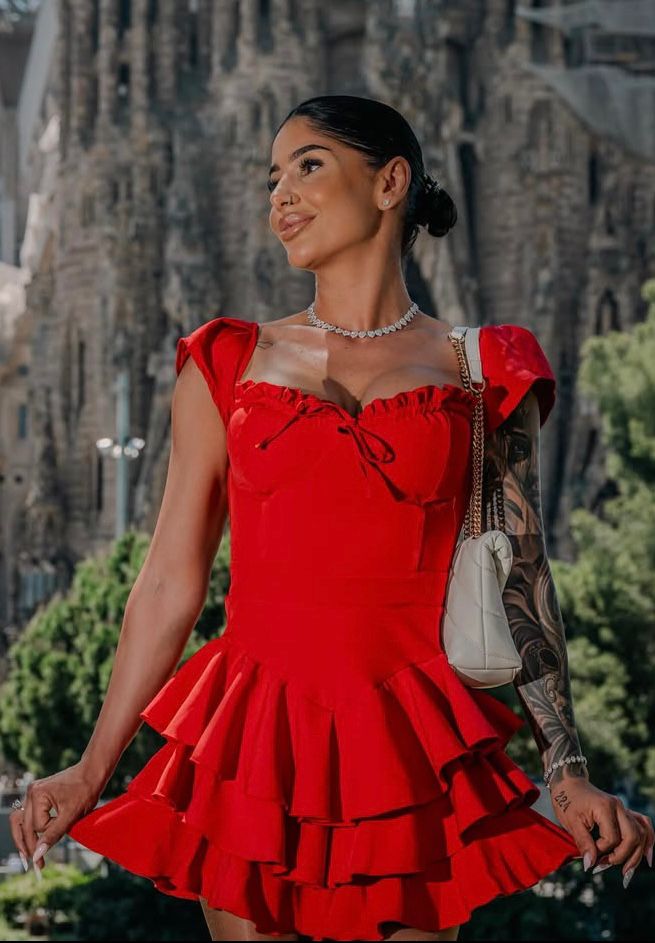 Monte Carlo Dress, este ușor elastică, cu un croi ce îți accentuează talia, bustul si picioarele.Poți obține o siluetă în formă de clepsidră datorită volanelor poziționate în partea de fustă și de bust.