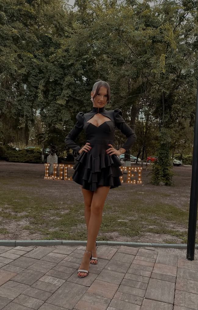Sugar Dress este rochia care atrage toate privirile. Creată dintr-un material cu ținută, într-o nuanță neagră clasică, această piesă evidențiază perfect talia și bustul printr-un decupaj geometric inedit. Volanele dispuse în cascadă adaugă volum și mișcare, iar croiul mini o transformă într-o alegere irezistibilă pentru petreceri sau ieșiri glam. Poart-o cu tocuri și accesorii strălucitoare pentru un look de neuitat.