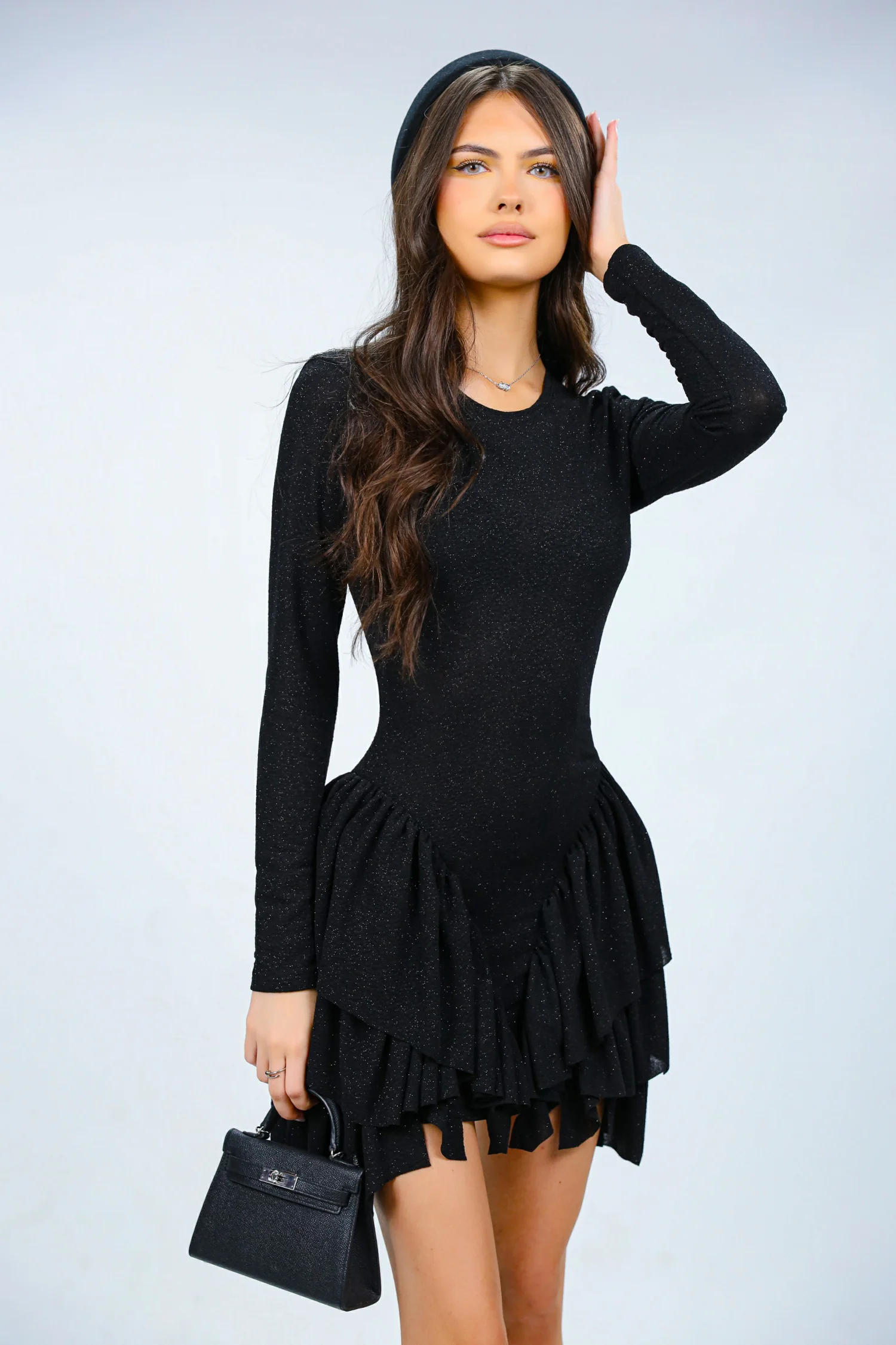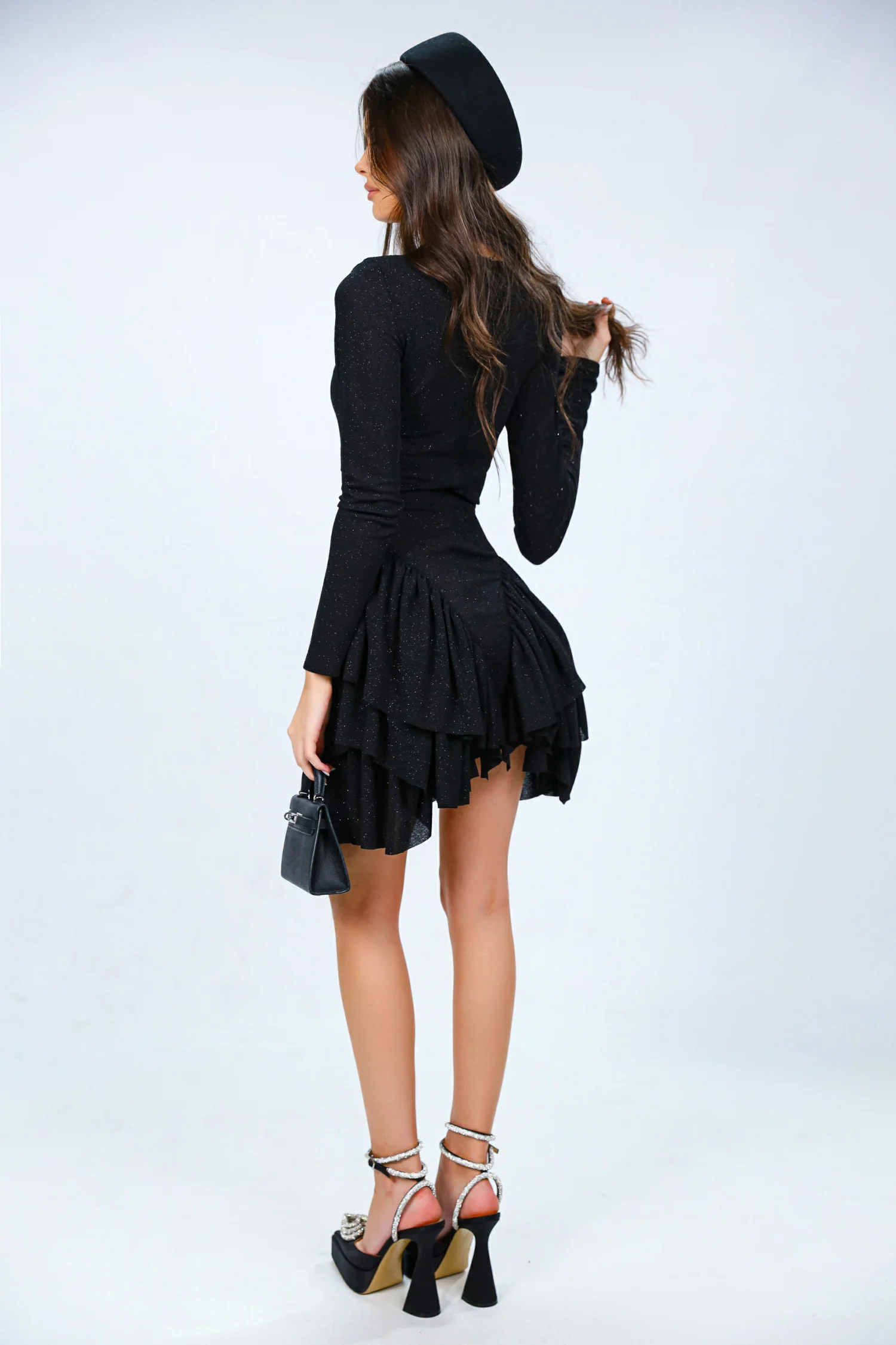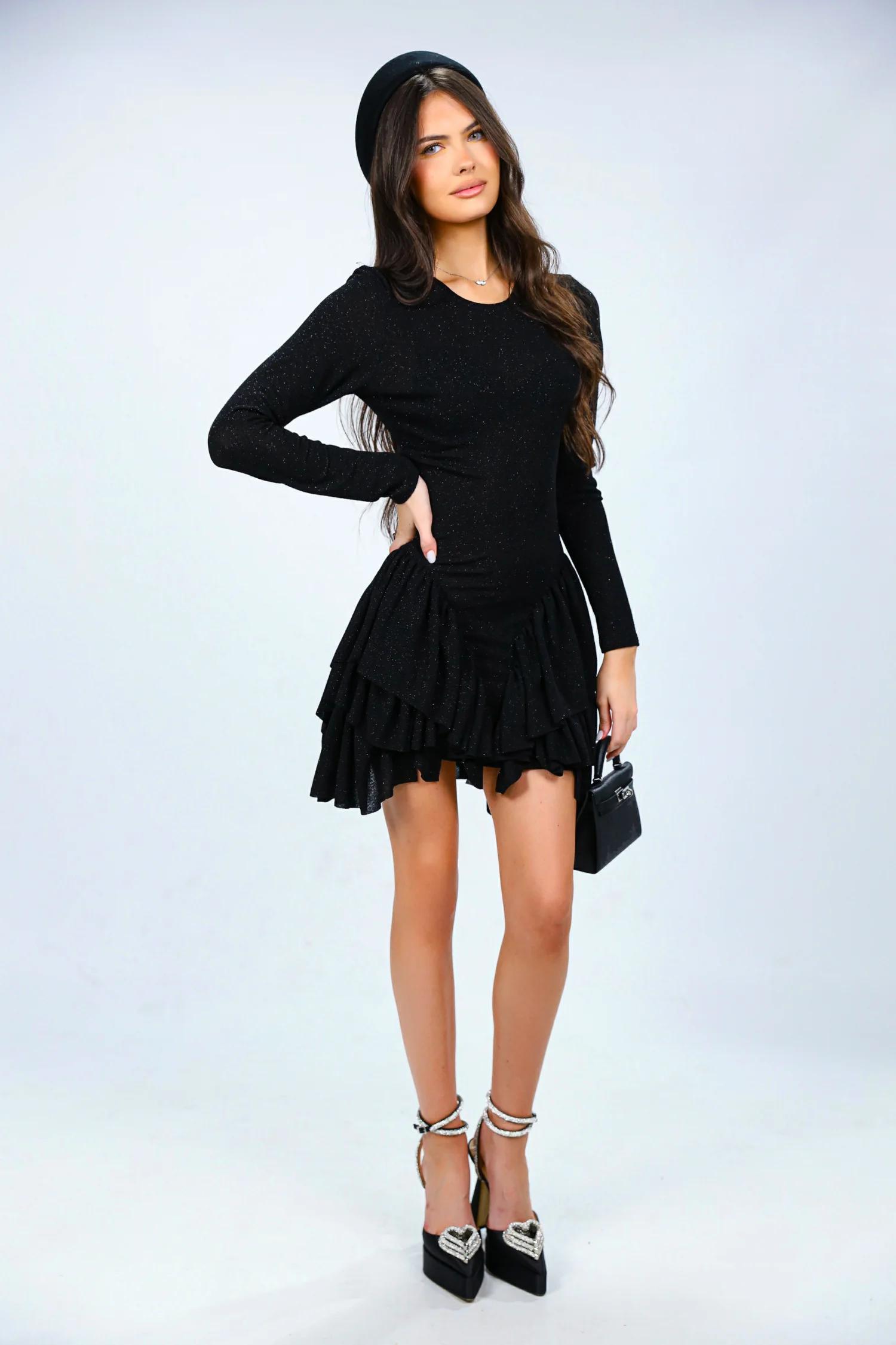 Sparkle Ruffle Dress este rochia care combină eleganța clasică cu strălucirea modernă. Confecționată dintr-un material elastic cu fire discrete sclipitoare, pune în valoare orice siluetă și oferă un aer glam fără să fie încărcată. Croiala cambrată îți subțiază talia, iar cele trei volane ample din partea inferioară creează un efect spectaculos la fiecare pas.